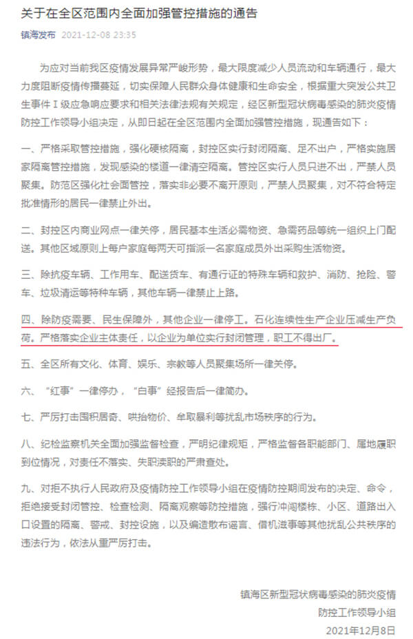 寧波鎮(zhèn)海決定在全區(qū)范圍內(nèi)全面升級管控措施,除防疫需要、民生保障外,其他企業(yè)一律停工,石化連續(xù)性生產(chǎn)企業(yè)壓減生產(chǎn)負(fù)荷。嚴(yán)格落實企業(yè)主體責(zé)任,以企業(yè)為單位實行封閉管理,職工不得出廠。